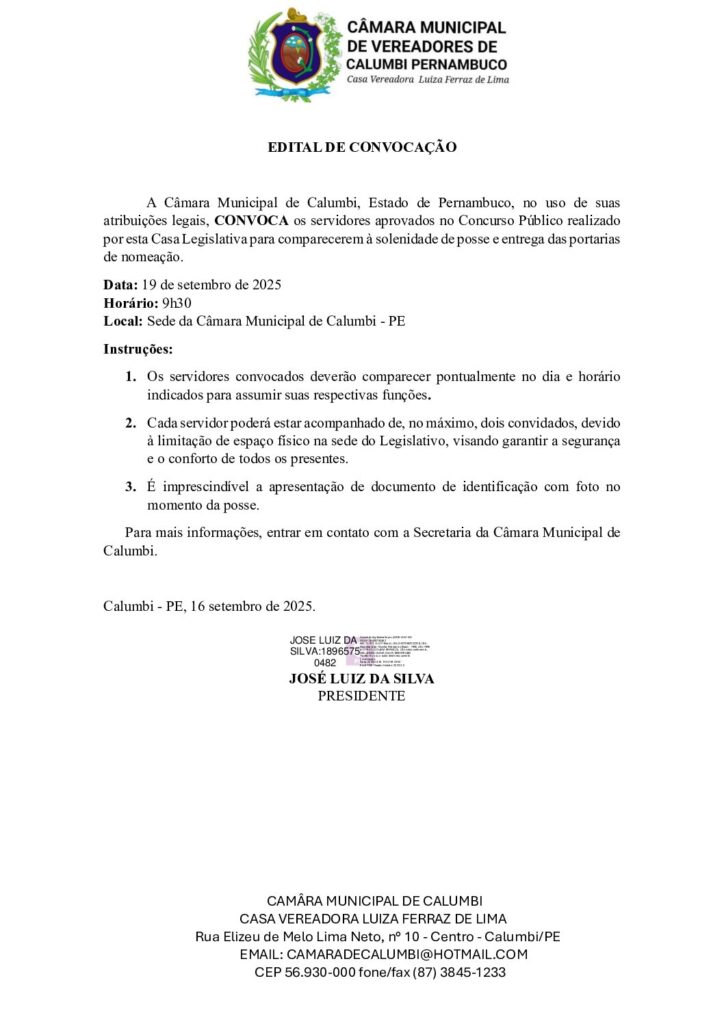 A Câmara Municipal de Calumbi convoca, com grande satisfação, os(as) candidatos(as) aprovados(as) no Concurso Público para participarem da cerimônia de posse, que acontecerá no próximo dia 19 de setembro de 2025, às 09:30h, na sede da Câmara.
