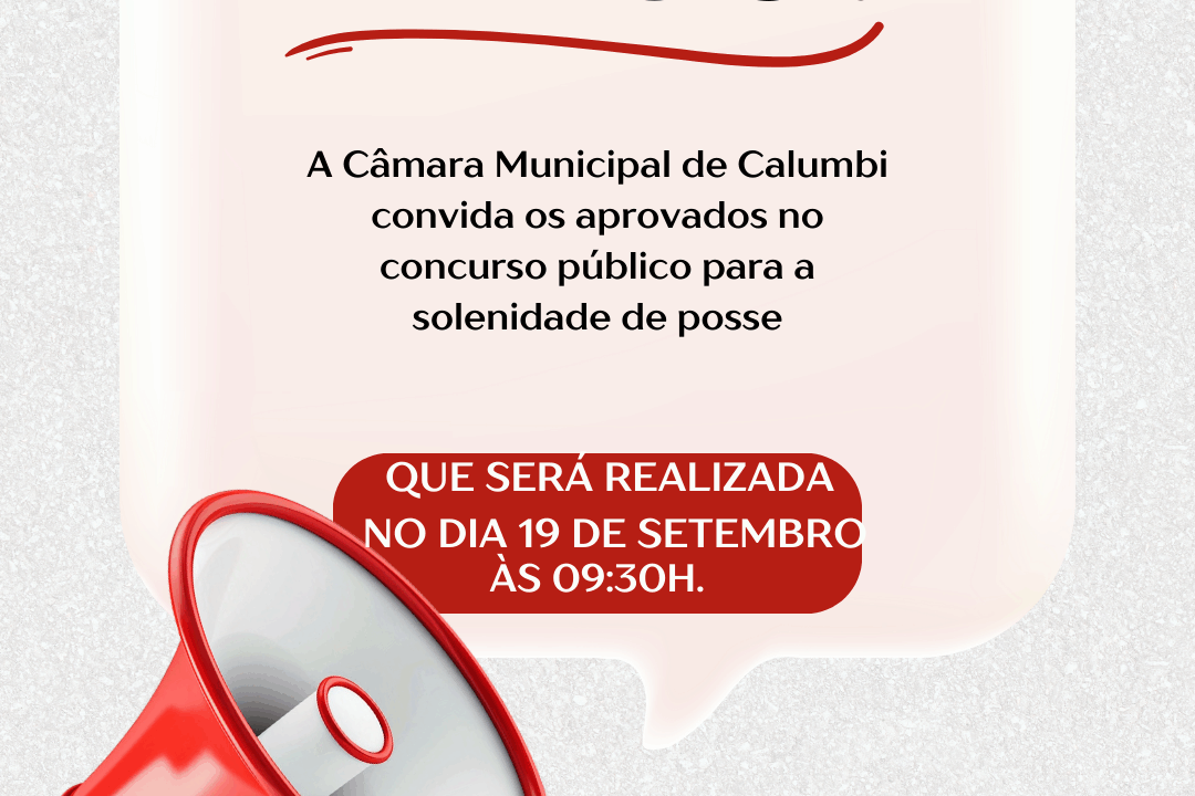 A Câmara Municipal de Calumbi convoca, com grande satisfação, os(as) candidatos(as) aprovados(as) no Concurso Público para participarem da cerimônia de posse, que acontecerá no próximo dia 19 de setembro de 2025, às 09:30h, na sede da Câmara.